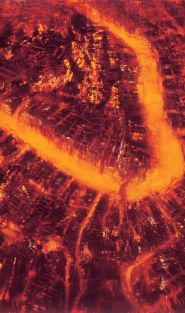 beginnt sie mit chaotischen Flecken und Strichen, die sie dann mit Pinseln,